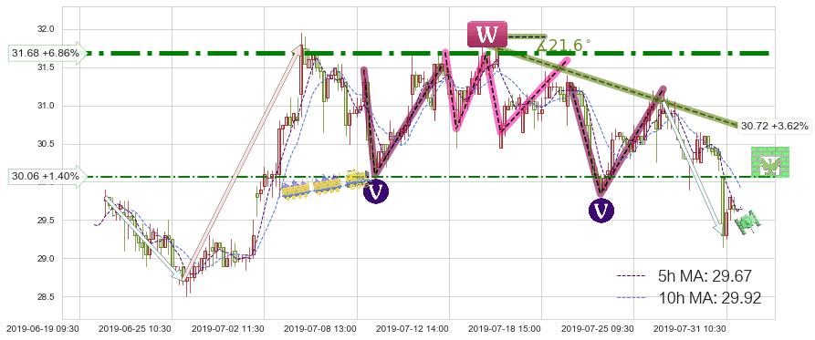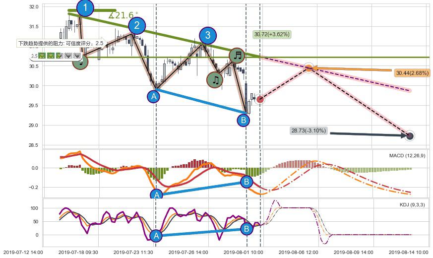 ➢ 预测:2019-08-05 15:00,【小幅反弹】稳定目前下跌趋势的前提下,预测价格:30.44
