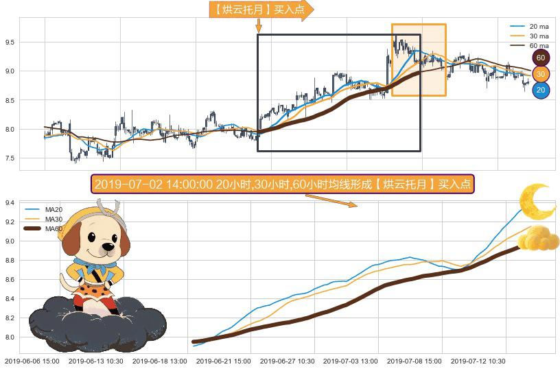形态多维评估: ⚀ 2019-06-18 15:00:00小时-2019-07-15 13:00:00小时显现 20小时-30小时-60小时均线 【烘云托月】买入点 看多信号,后市看涨,买入
