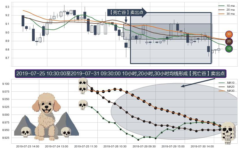 形态多维评估: ⚀ 2019-07-25 11:30:00-小时至2019-07-31 09:30:00-小时显现 10小时-20小时-30小时均线 【死亡谷】卖出点 看空信号,后市看跌,卖出