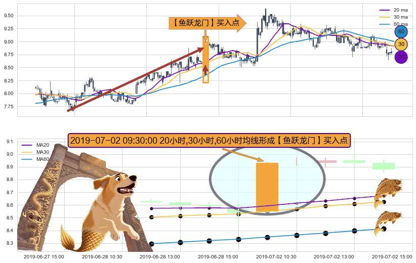 形态多维评估: ⚀ 2019-07-02 09:30:00小时显现 20小时-30小时-60小时均线 【鱼跃龙门】买入点 看多信号,后市看涨,买入