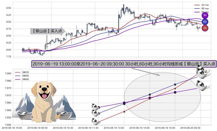 形态多维评估: ⚀ 2019-06-19 14:00:00-小时至2019-06-20 09:30:00-小时显现 30小时-60小时-90小时均线 【银山谷】买入点 看多信号,后市看涨,买入
