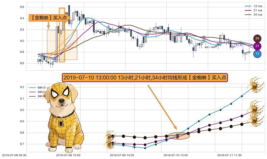 形态多维评估: ⚀ 2019-07-10 13:00:00小时显现 13小时-21小时-34小时均线 【金蜘蛛】买入点 看多信号,后市看涨,买入