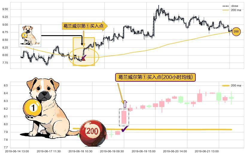 形态多维评估: ⚀ 2019-06-19 09:30:00-小时显现 葛兰威尔均线 200小时均线 第买①入点 走势反转见底信号,后市看涨,买进信号