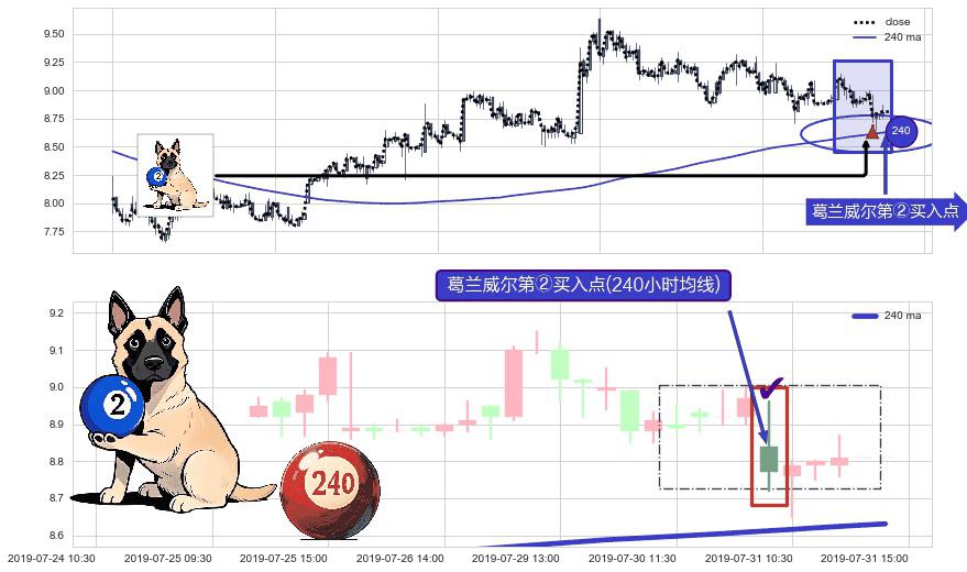 形态多维评估: ⚀ 2019-07-31 09:30:00-小时显现 葛兰威尔均线 240小时均线 第②买入点 上升趋势的中继信号,后市看涨,买进信号