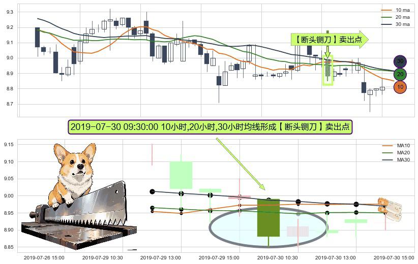 形态多维评估: ⚀ 2019-07-30 09:30:00小时显现 10小时-20小时-30小时均线 【断头铡刀】卖出点 看空信号,后市看跌,卖出