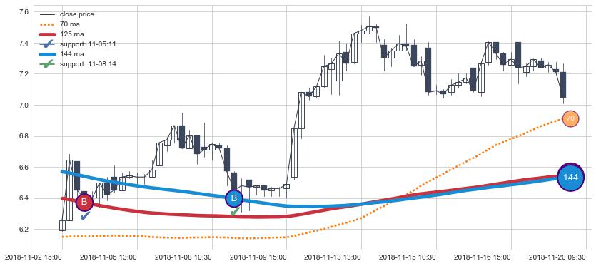 上涨趋势11-02 15:00-11-20 09:30,均线144, 125确认关键支撑2处