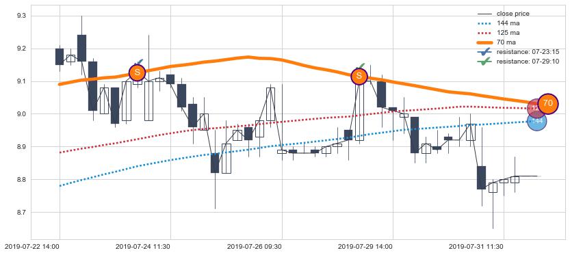 下跌趋势07-22 14:00-07-31 15:00,均线70确认关键阻力2处
