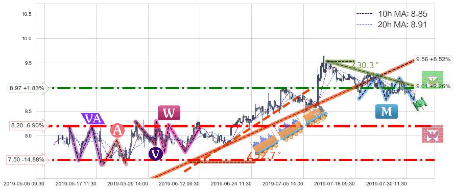 ♘ 支撑价格位8.20,可信任强度92.44%,距离最后交易2019-07-31 15:00形成的收盘价格8.81相差 -6.90%