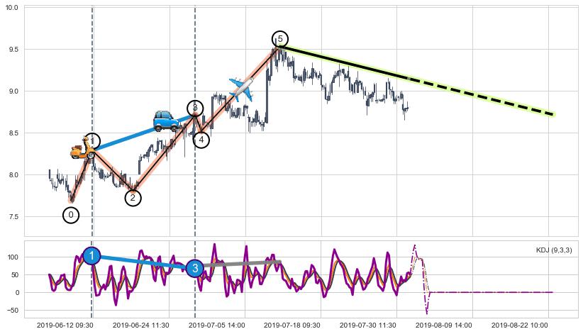 ➢ 第一, 三驱动浪端点:【KDJ】走势出现【常规背离 & 反转信号】背离程度69.61%,背离夹角角度62.1˚,背离程度较大