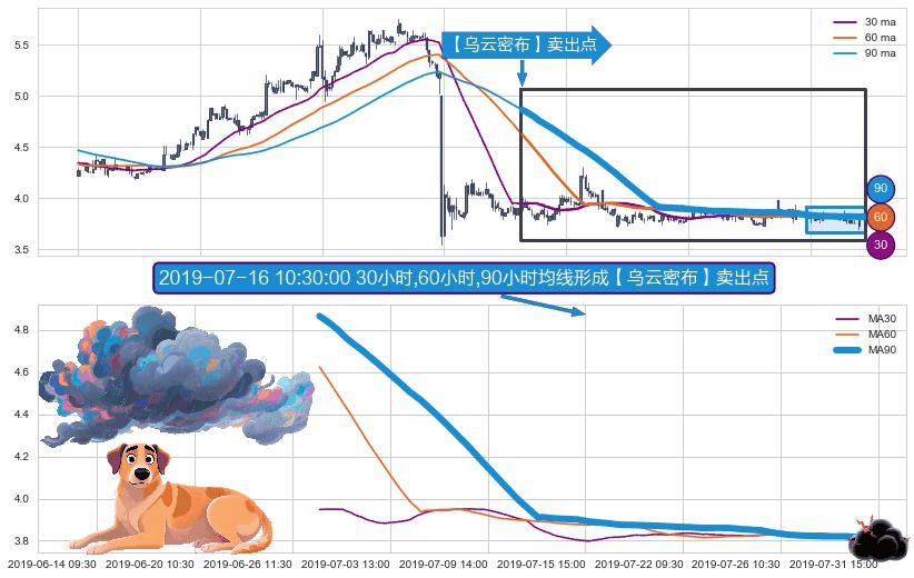 形态多维评估: ⚀ 2019-06-27 13:00:00小时-2019-07-31 15:00:00小时显现 30小时-60小时-90小时均线 【乌云密布】卖出点 看空信号,后市看跌,卖出
