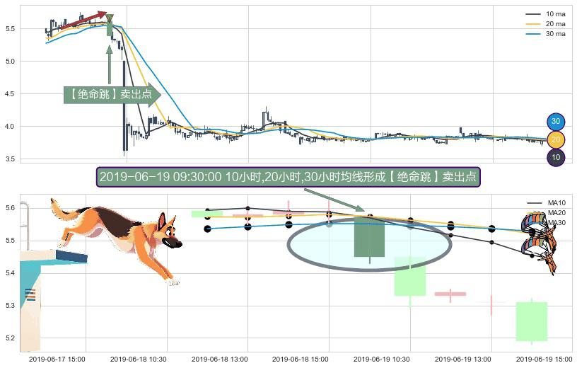 形态多维评估: ⚀ 2019-06-19 09:30:00小时显现 10小时-20小时-30小时均线 【绝命跳】卖出点 看空信号,后市看跌,卖出