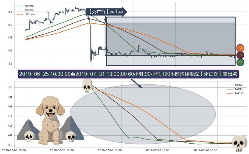 形态多维评估: ⚀ 2019-06-25 11:30:00-小时至2019-07-31 13:00:00-小时显现 60小时-90小时-120小时均线 【死亡谷】卖出点 看空信号,后市看跌,卖出