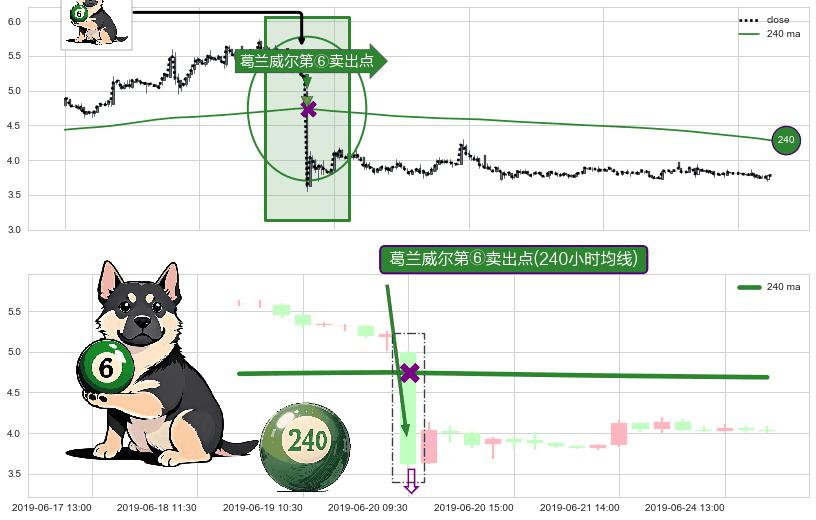 形态多维评估: ⚀ 2019-06-20 09:30:00-小时显现 葛兰威尔均线 240小时均线 第⑥卖出点 走势反转见顶信号,后市看跌,卖出信号