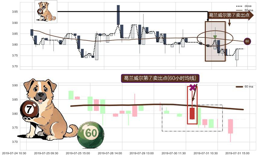 形态多维评估: ⚀ 2019-07-30 13:00:00-小时显现 葛兰威尔均线 60小时均线 第⑦卖出点 下降趋势的中继信号,后市看跌,卖出信号