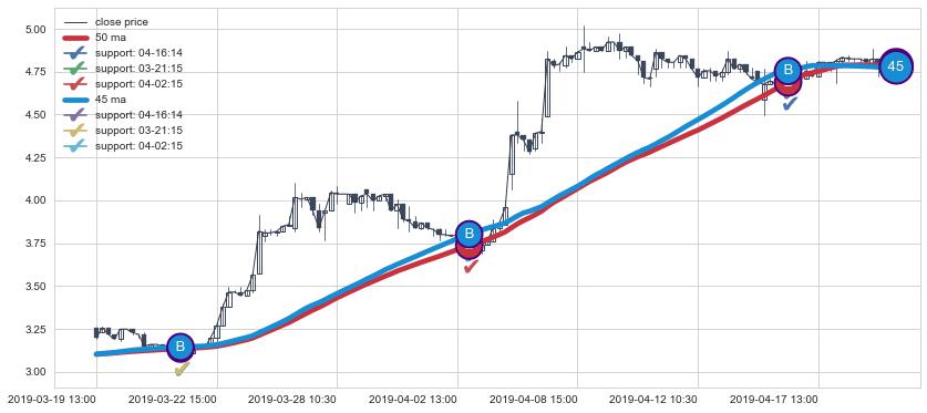 上涨趋势03-19 13:00-04-23 10:30,均线50, 45确认关键支撑3处