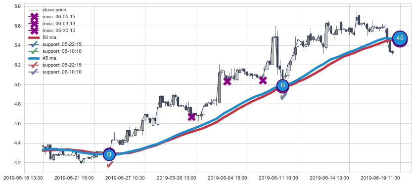 上涨趋势05-16 13:00-06-19 11:30,均线50, 45确认关键支撑2处
