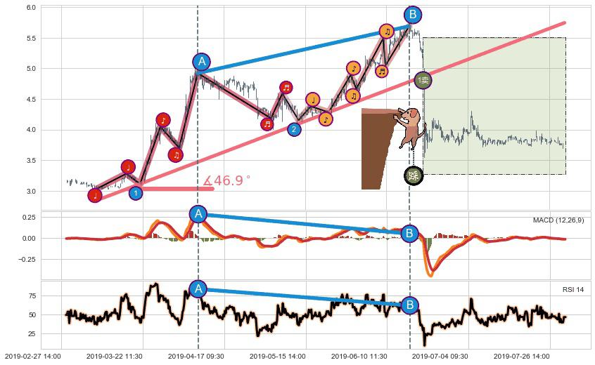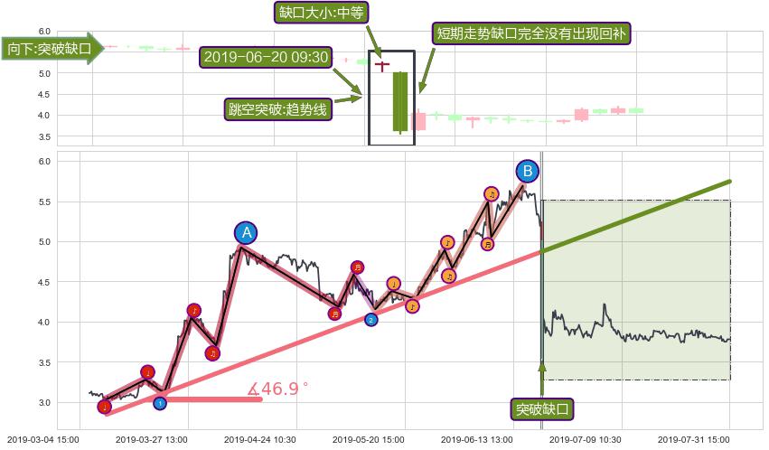 ✂️ 2019-03-11 09:30-2019-06-19 15:00上升趋势存在反转[风险],其原上升趋势的支撑位(5.75)已破位[强阻力信号],原上升趋势角度: 46.9˚