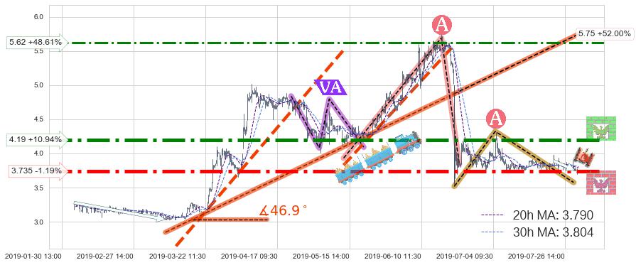 ♘ 阻力价格位5.62,可信任强度56.14%,距离最后交易2019-07-31 15:00形成的收盘价格3.780相差 +48.61%