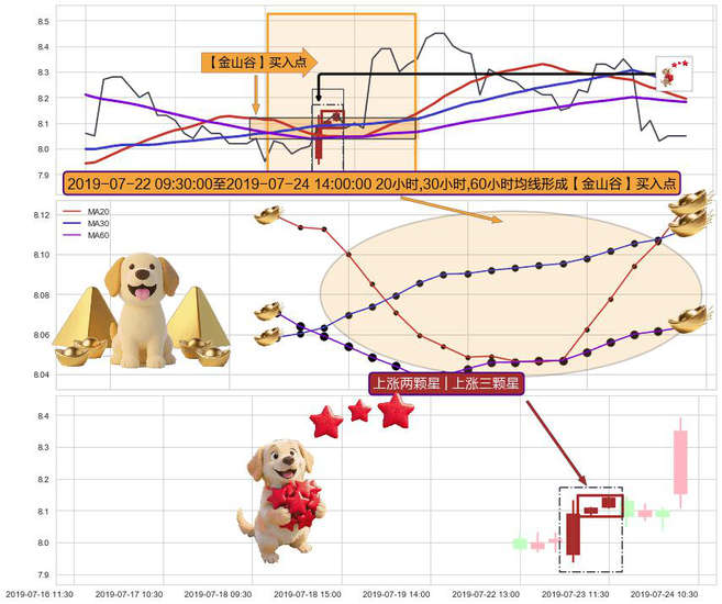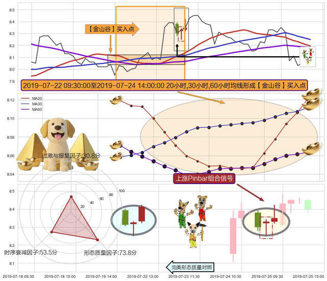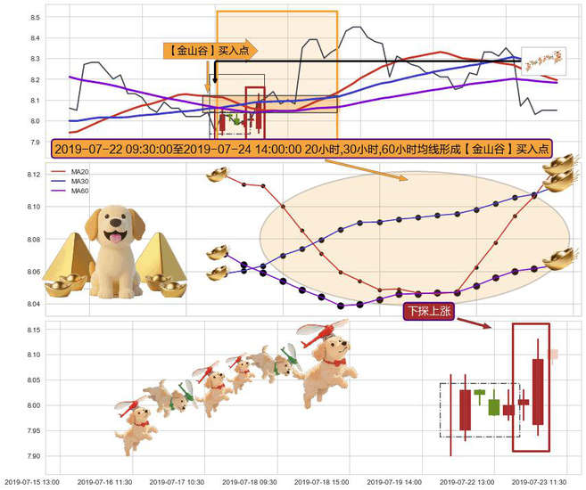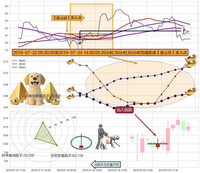 ➣ 2019-07-22 10:30:00-小时至2019-07-24 14:00:00-小时显现 20小时-30小时-60小时均线 【金山谷】买入点 其再次确认了买入信号,可靠性更强,买入