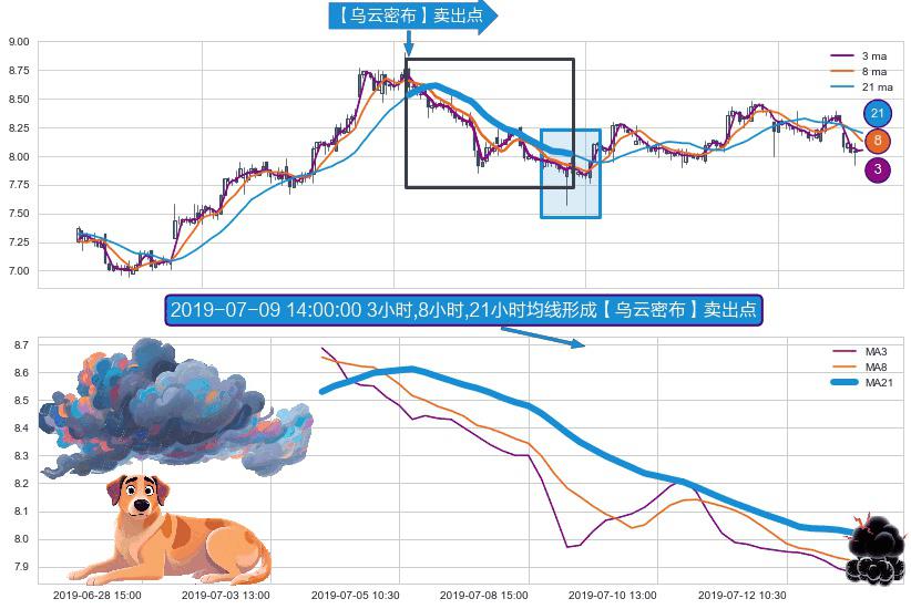 ⚀ 2019-07-04 10:30:00小时-2019-07-15 10:30:00小时显现 3小时-8小时-21小时均线 【乌云密布】卖出点 看空信号,后市看跌,卖出