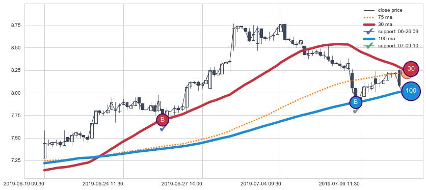 ⚂ 2019-07-23 09:30:00小时突然冒出一根大阳线,一下子顶穿三条均线且收盘价收在各条均线之上