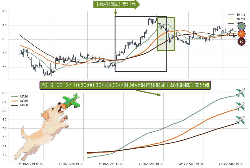 ⚀ 2019-06-18 15:00:00小时-2019-07-08 11:30:00小时显现 30小时-60小时-90小时均线 【战机起航】卖出点 看空信号,后市看跌,卖出