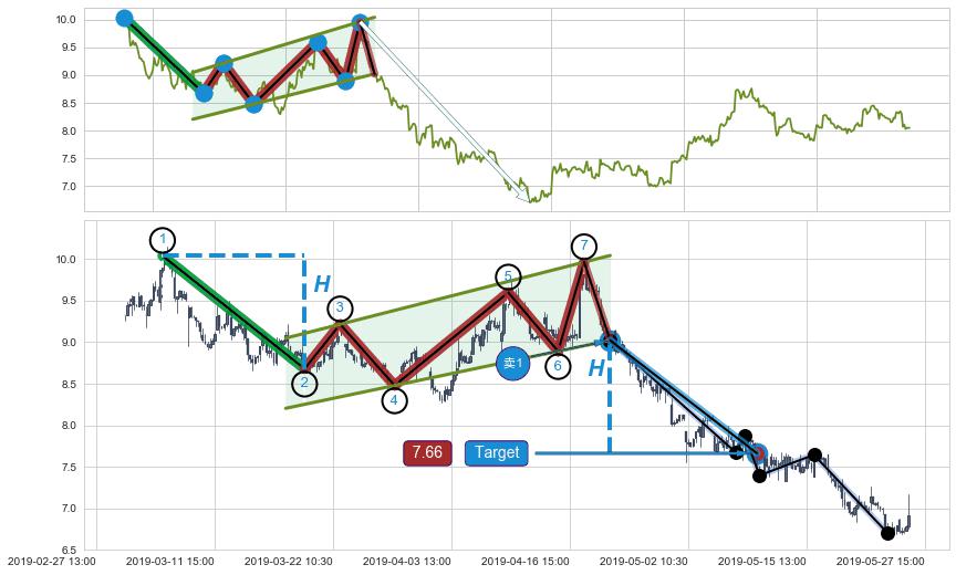 从2019-05-23 10:30至2019-06-17 09:30,共包含96个小时,阶段股价上涨4.75%,阶段股价变动位移路程比: 1 : 14