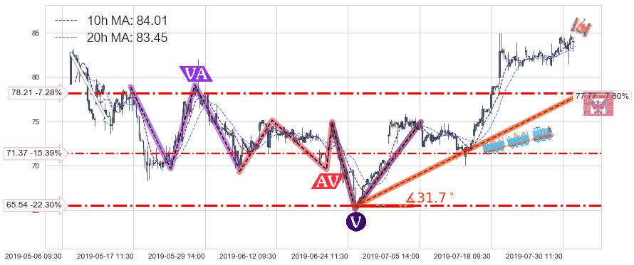从2019-06-04 14:00至2019-06-20 13:00,共包含66个小时,阶段股价上涨5.40%,阶段股价变动位移路程比: 1 : 7