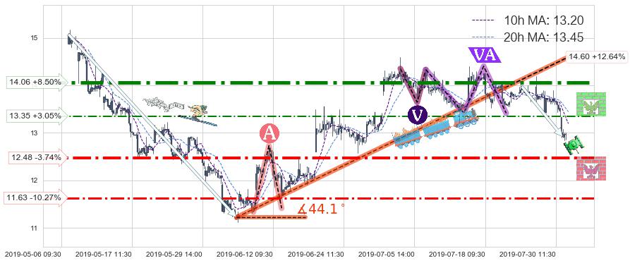 ♘ 阻力价格位13.35,可信任强度49.75%,距离最后交易2019-07-31 15:00形成的收盘价格12.96相差 +3.05%