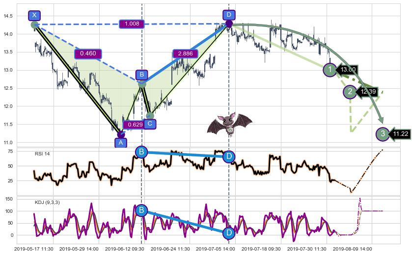 ➣ 已完成【蝙蝠】形态起点X: 05-10:15, 终点D: 07-04:13, 共215交易小时