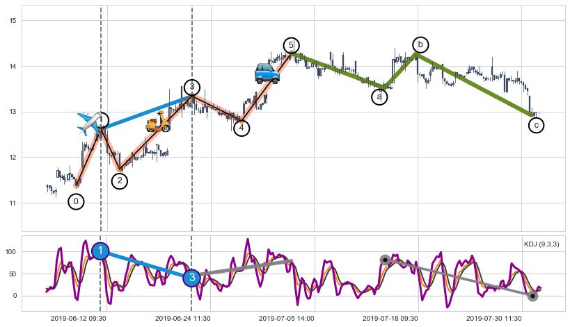 ➣ 第一, 三驱动浪端点:【KDJ】走势出现【常规背离 & 反转信号】背离程度99.00%,背离夹角角度110.0˚,背离程度较大