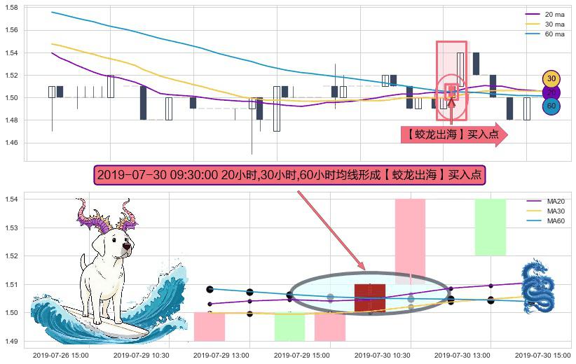 形态多维评估: ⚀ 2019-07-30 09:30:00小时显现 20小时-30小时-60小时均线 【蛟龙出海】买入点 看多信号,后市看涨,买入
