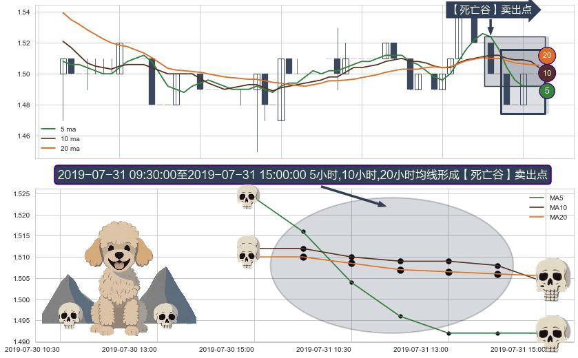 形态多维评估: ⚀ 2019-07-31 10:30:00-小时至2019-07-31 15:00:00-小时显现 5小时-10小时-20小时均线 【死亡谷】卖出点 看空信号,后市看跌,卖出