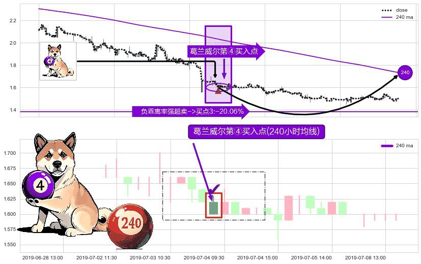 形态多维评估: ⚀ 2019-07-03 15:00:00-小时显现 葛兰威尔均线 240小时均线 第④买入点 下降趋势均值回复的短线反弹信号,后市看涨,买进信号