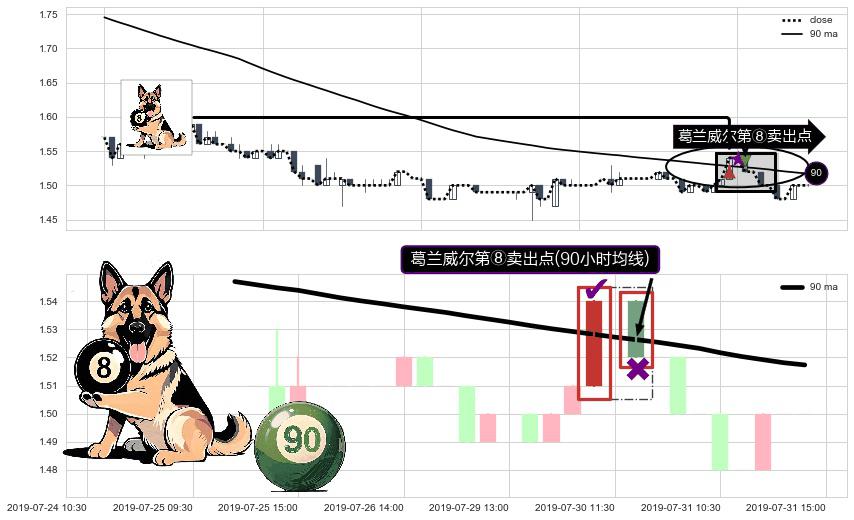 形态多维评估: ⚀ 2019-07-30 13:00:00-小时显现 葛兰威尔均线 90小时均线 第⑧卖出点 下降趋势的中继信号,后市看跌,卖出信号