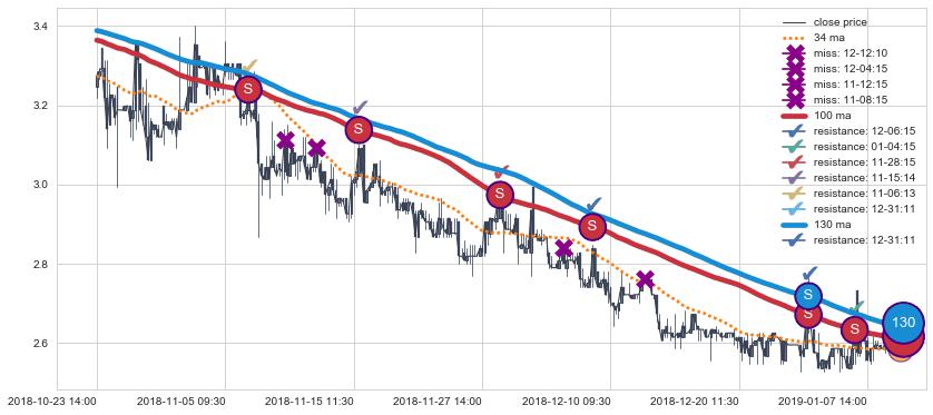 下跌趋势03-06 11:30-03-15 14:00,均线34确认关键阻力2处