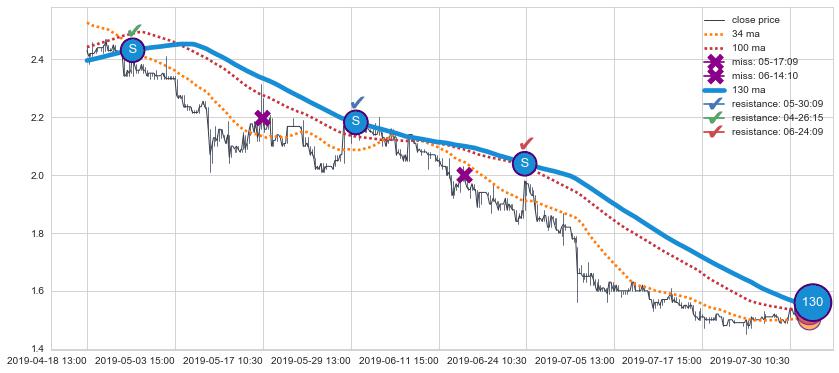 下跌趋势04-18 13:00-07-30 15:00,均线130确认关键阻力3处