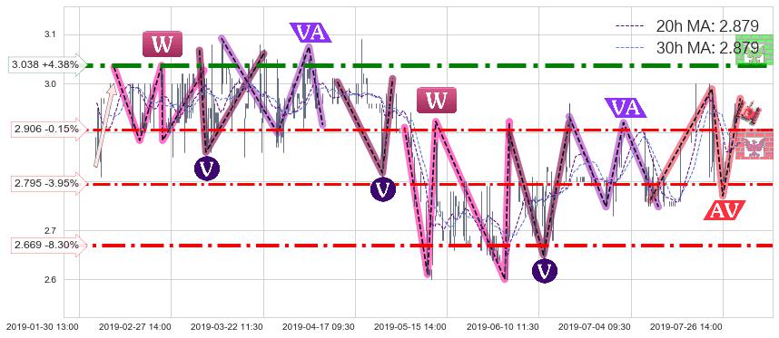 ♘ 支撑价格位2.906,可信任强度68.55%,距离最后交易2019-07-31 15:00形成的收盘价格2.910相差 -0.15%