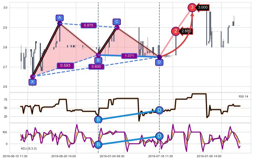 ➢ 谐波价格D点比B点低 ⤵,【KDJ】指标D点比B点高 ⤴️