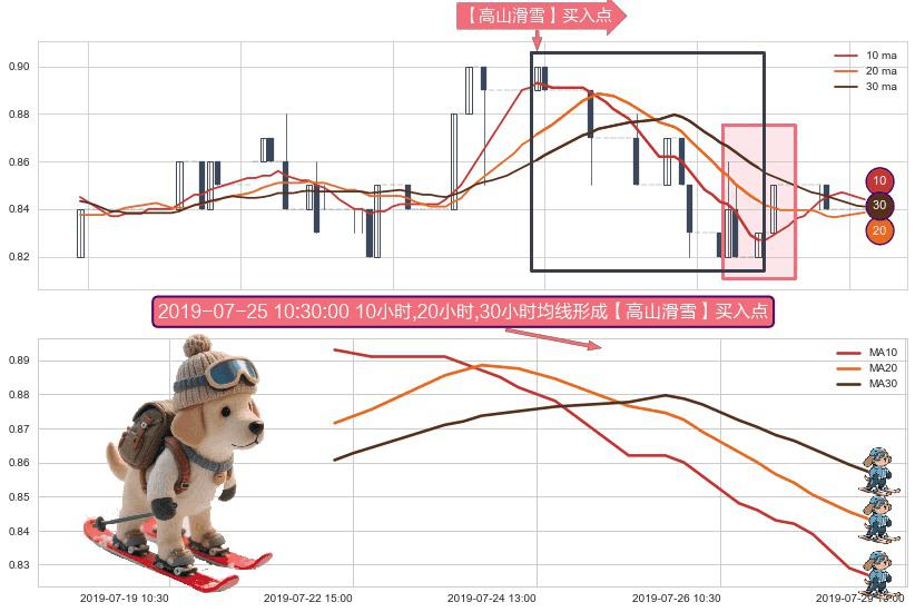 形态多维评估: ⚀ 2019-07-22 14:00:00小时-2019-07-29 13:00:00小时显现 10小时-20小时-30小时均线 【高山滑雪】买入点 看多信号,后市看涨,买入