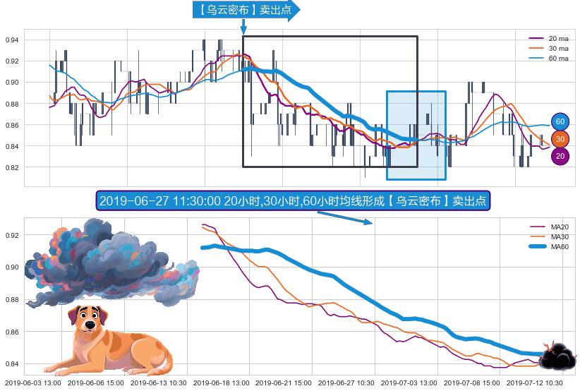 形态多维评估: ⚀ 2019-06-14 09:30:00小时-2019-07-11 13:00:00小时显现 20小时-30小时-60小时均线 【乌云密布】卖出点 看空信号,后市看跌,卖出