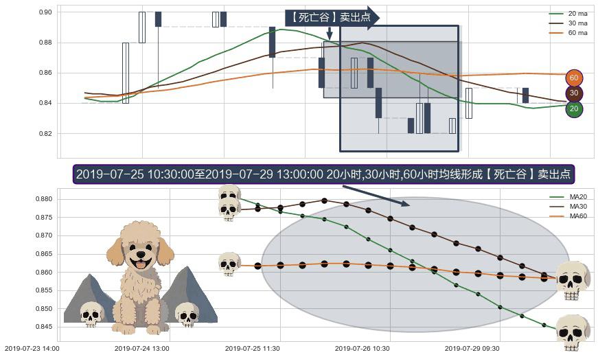 形态多维评估: ⚀ 2019-07-25 11:30:00-小时至2019-07-29 13:00:00-小时显现 20小时-30小时-60小时均线 【死亡谷】卖出点 看空信号,后市看跌,卖出