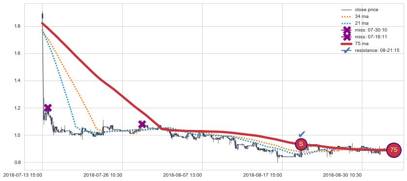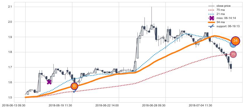 下跌趋势06-17 11:30-07-05 15:00,均线34, 75确认关键阻力2处