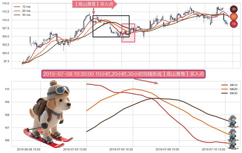 ⚀ 2019-07-03 13:00:00小时-2019-07-10 14:00:00小时显现 10小时-20小时-30小时均线 【高山滑雪】买入点 看多信号,后市看涨,买入