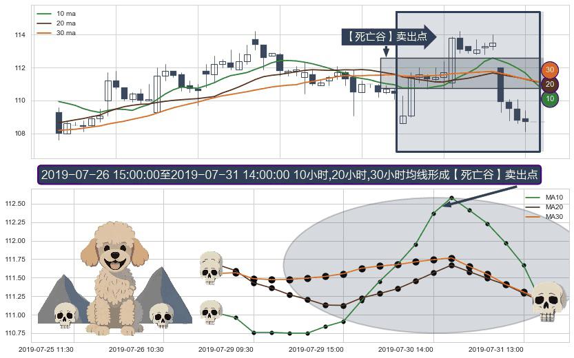 ⚀ 2019-07-29 09:30:00-小时至2019-07-31 14:00:00-小时显现 10小时-20小时-30小时均线 【死亡谷】卖出点 看空信号,后市看跌,卖出