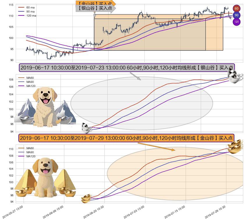 ⚃ 2019-06-17 11:30:00-小时至2019-07-29 13:00:00-小时显现 60小时-90小时-120小时均线 【金山谷】买入点 其再次确认了买入信号,可靠性更强,买入