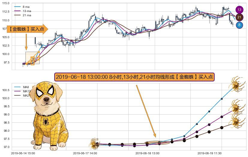⚀ 2019-06-18 13:00:00小时显现 8小时-13小时-21小时均线 【金蜘蛛】买入点 看多信号,后市看涨,买入