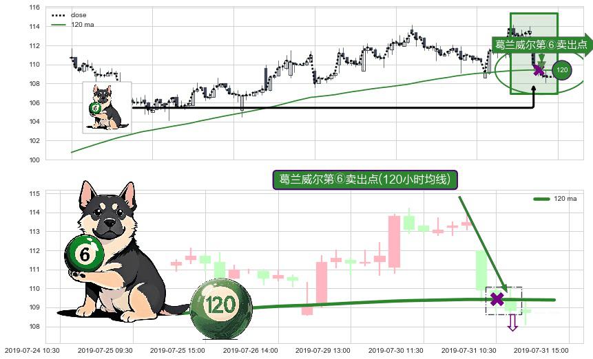 ⚀ 2019-07-31 11:30:00-小时显现 葛兰威尔均线 120小时均线 第⑥卖出点 走势反转见顶信号,后市看跌,卖出信号