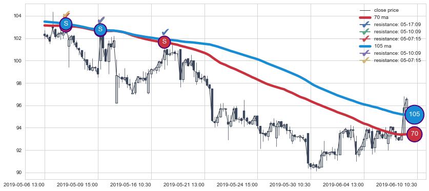 ➢ 最优均线组合共正确确认支撑阻力信号10处,正确确认率 71.43%