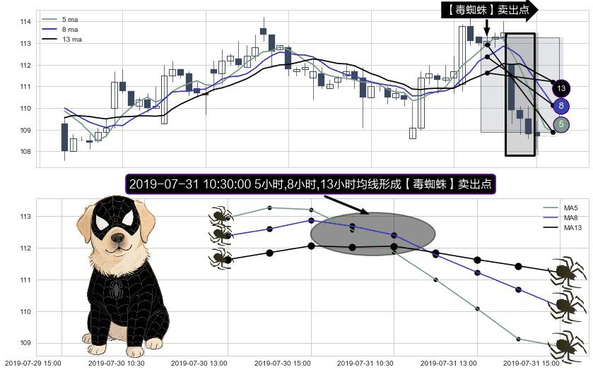 ⚀ 2019-07-31 10:30:00小时显现 5小时-8小时-13小时均线 【毒蜘蛛】卖出点 看空信号,后市看跌,卖出